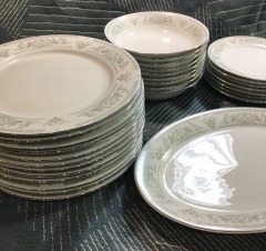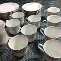 42 pieces of a Fairfield china set, white with blue flowers, made in China.